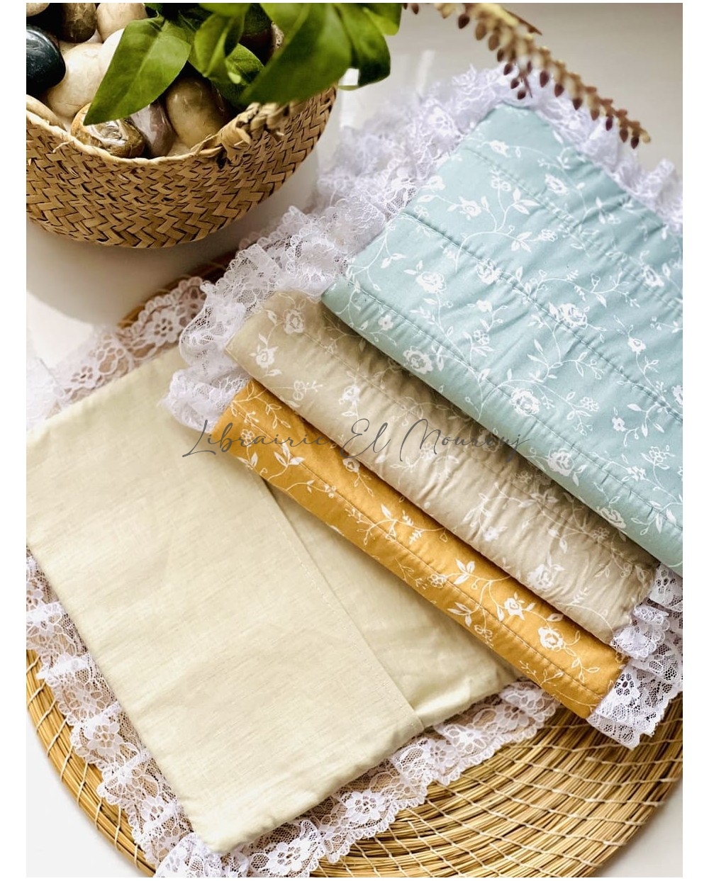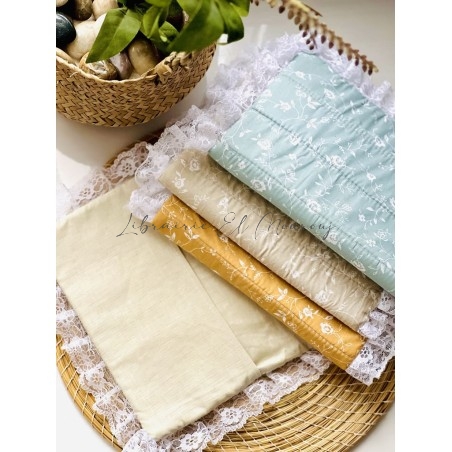 غلاف ناعم من القطن الخالص، مزين بزخارف زهرية رقيقة ودانتيل أبيض كنسيم الفجر. تصميمه يستحضر الهدوء والسكينة، وكأنه همسة لطيفة ترافق تلاوة القرآن، ليجعل كل لحظة عبادة أكثر دفئًا ونورًا.