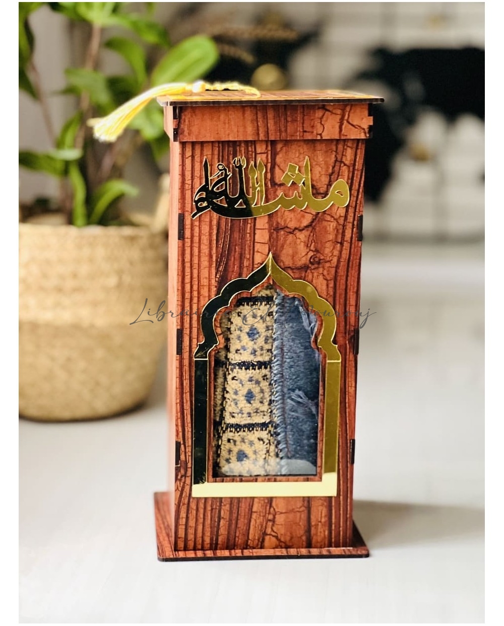 يعلو العلبة نقش كلمة «ما شاء الله» بخط عربي راقٍ، مع شرّابة ناعمة تضفي لمسة روحانية هادئة.
