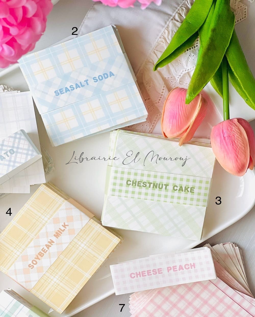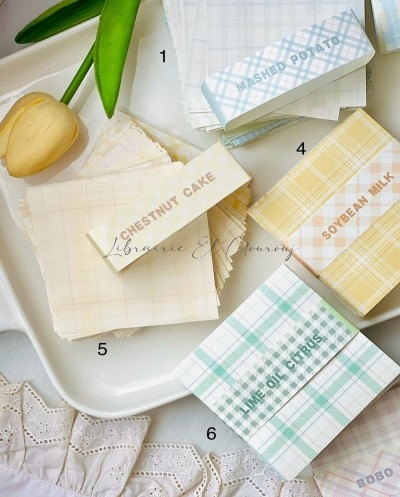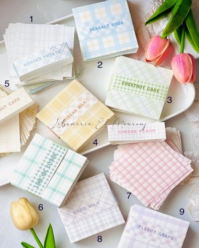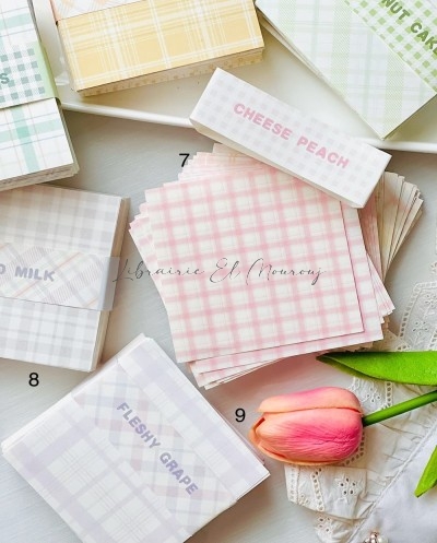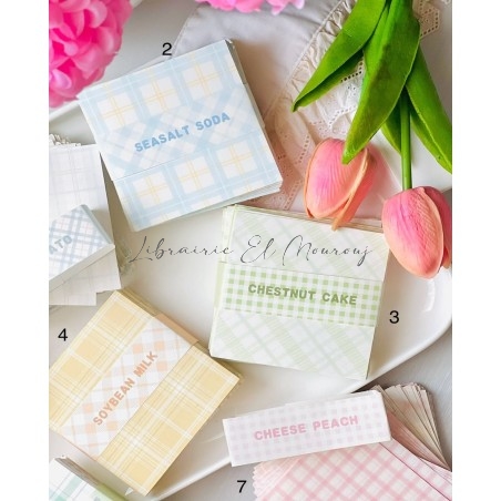Déclinées en 9 palettes délicates aux motifs carreaux (vichy et tartan), ces petites cartes allient esthétique minimaliste et inspiration vintage. Chaque collection — Seasalt Soda, Chestnut Cake, Soybean Milk, Cheese Peach, Lime Oil Citrus, Bobo Milk ou encore Fleshy Grape — évoque une ambiance tendre et gourmande, parfaite pour sublimer vos pages.