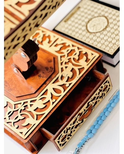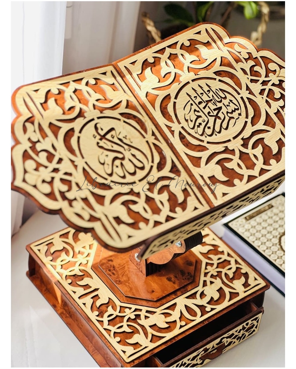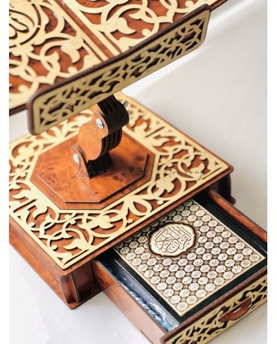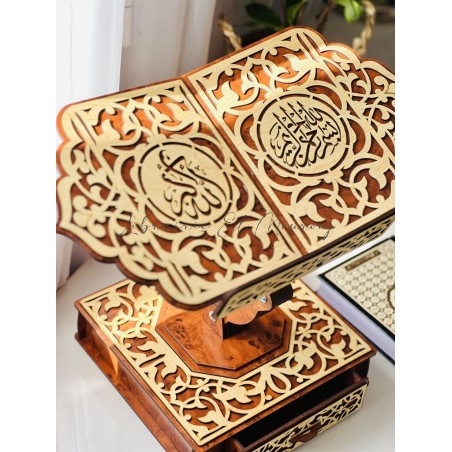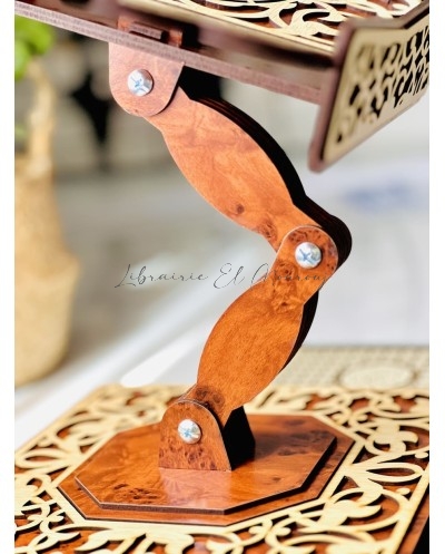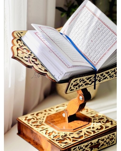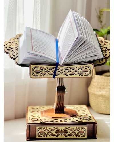 حامل مصحف خشبي فاخرمصحوب بسبحة ومصحف ، مُزيَّن بنقوش عربية متداخلة محفورة بدقة، تتوسطها آيات وكلمات قرآنية تزيده وقارًا وجمالًا. تصميمه المتقن يوازن بين القوة والنعومة، ليكون ليس فقط أداة لحمل المصحف، بل تحفة تزيّن المكان وتضفي عليه سكينة وروحانية. اختيار مثالي لمحبي الذوق الرفيع والتفاصيل الأصيلة