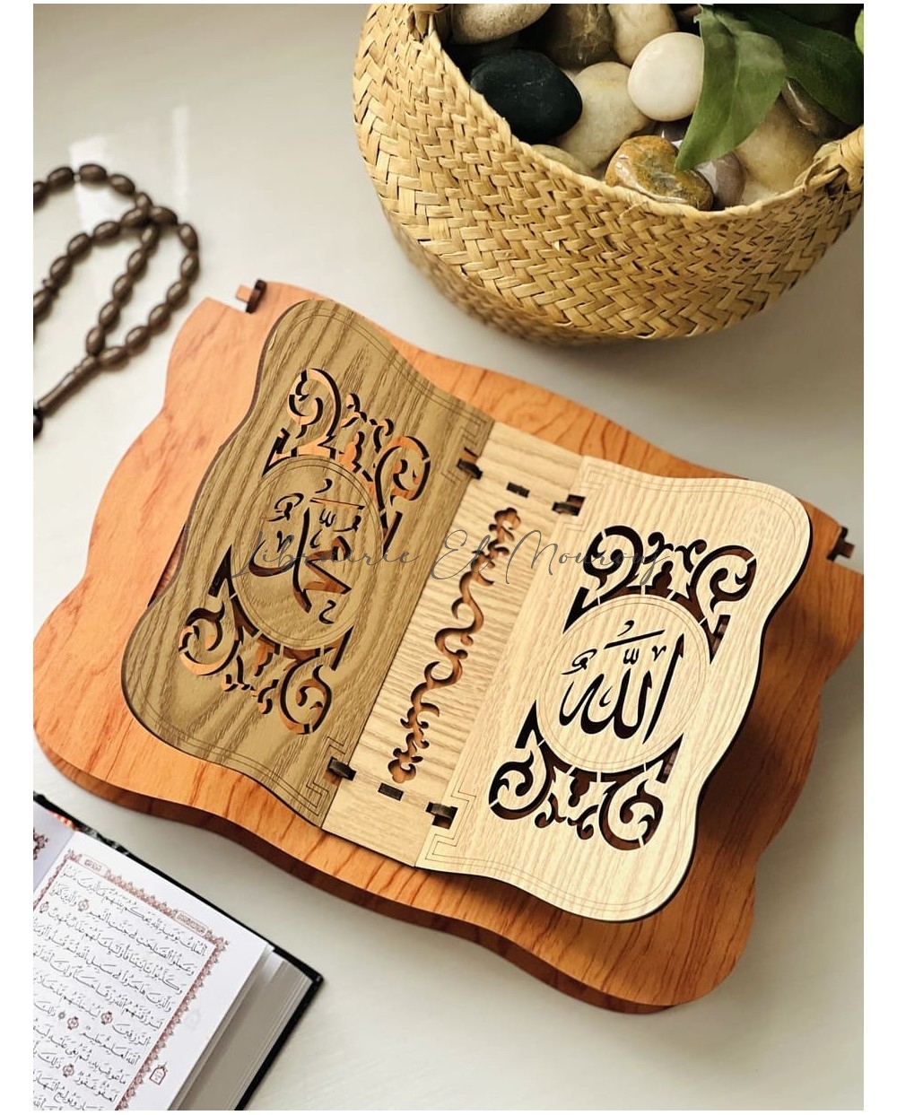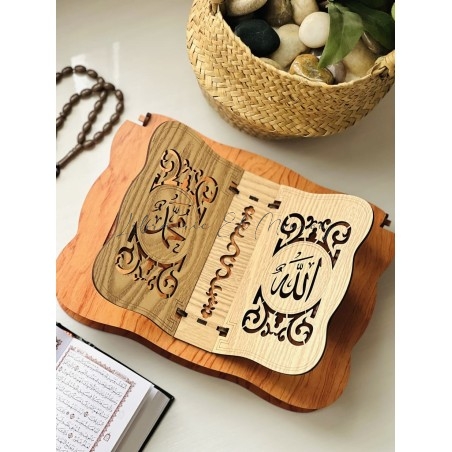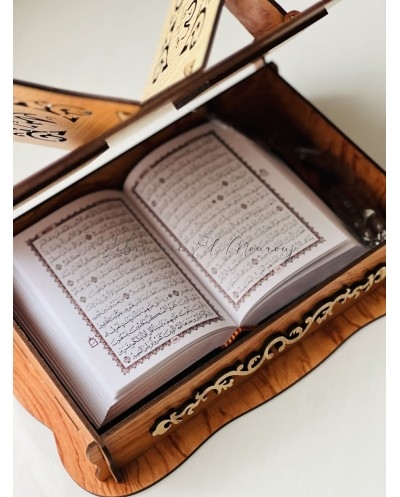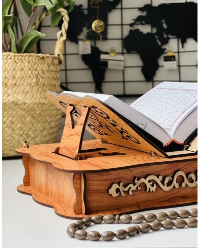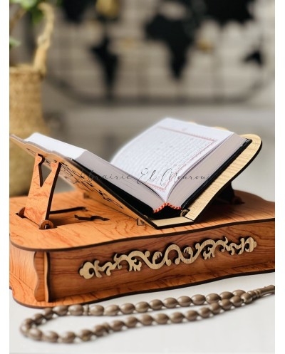 حامل مصحف مصنوع من الخشب بتصميم راقٍ ، مزخرف بنقوش شرقية دقيقة تعكس روح الأصالة. صُمّم بزاوية مريحة لتسهيل القراءة، مع قاعدة ثابتة تمنح استقرارًا وأناقة في آنٍ واحد.