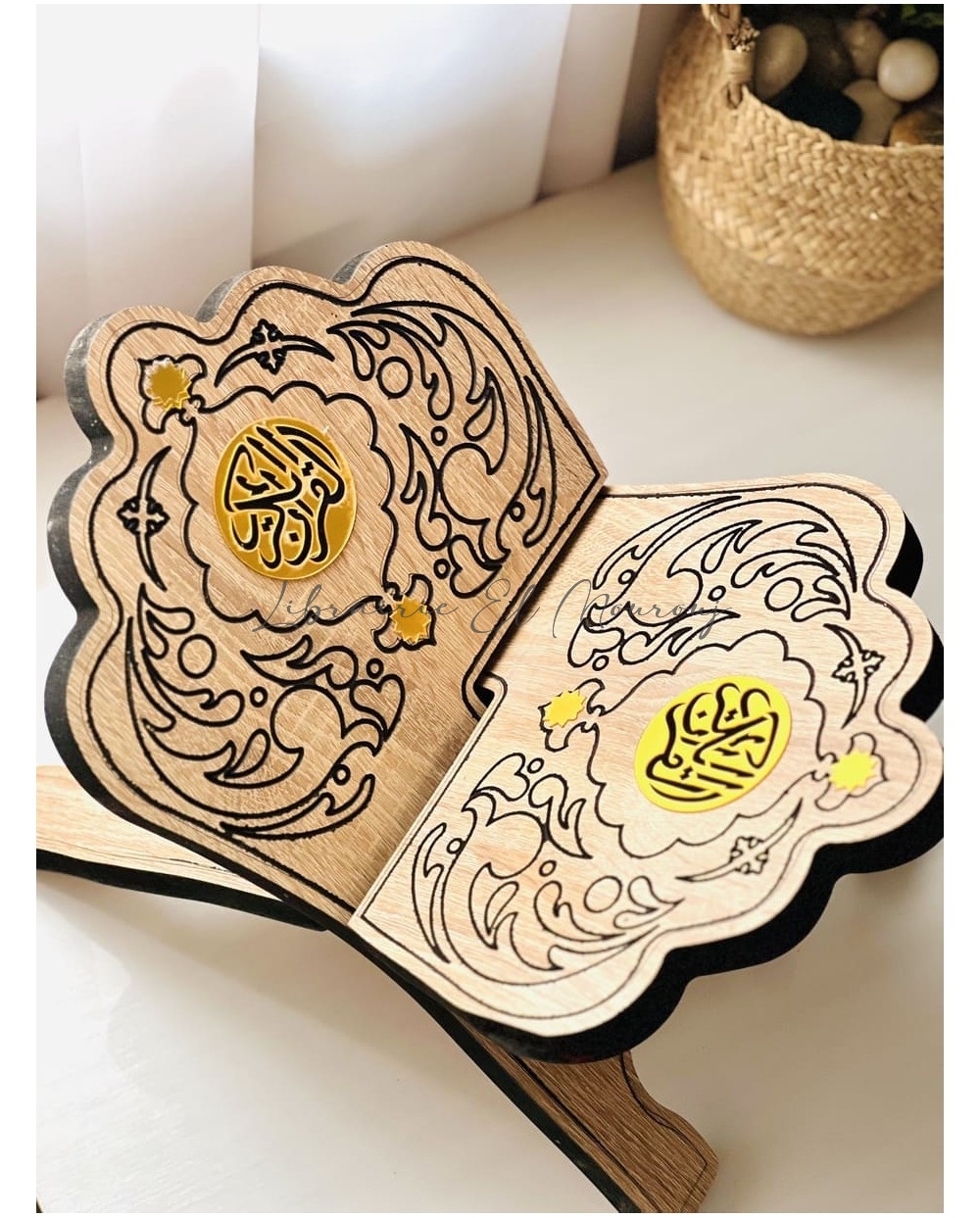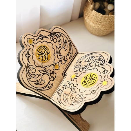 حامل مصحف خشبي فاخر مصنوع من خشب، يتميّز بتصميم إسلامي أنيق على شكل كتاب مفتوح، محفور بنقوش عربية دقيقة تضفي لمسة من الفخامة والروحانية.