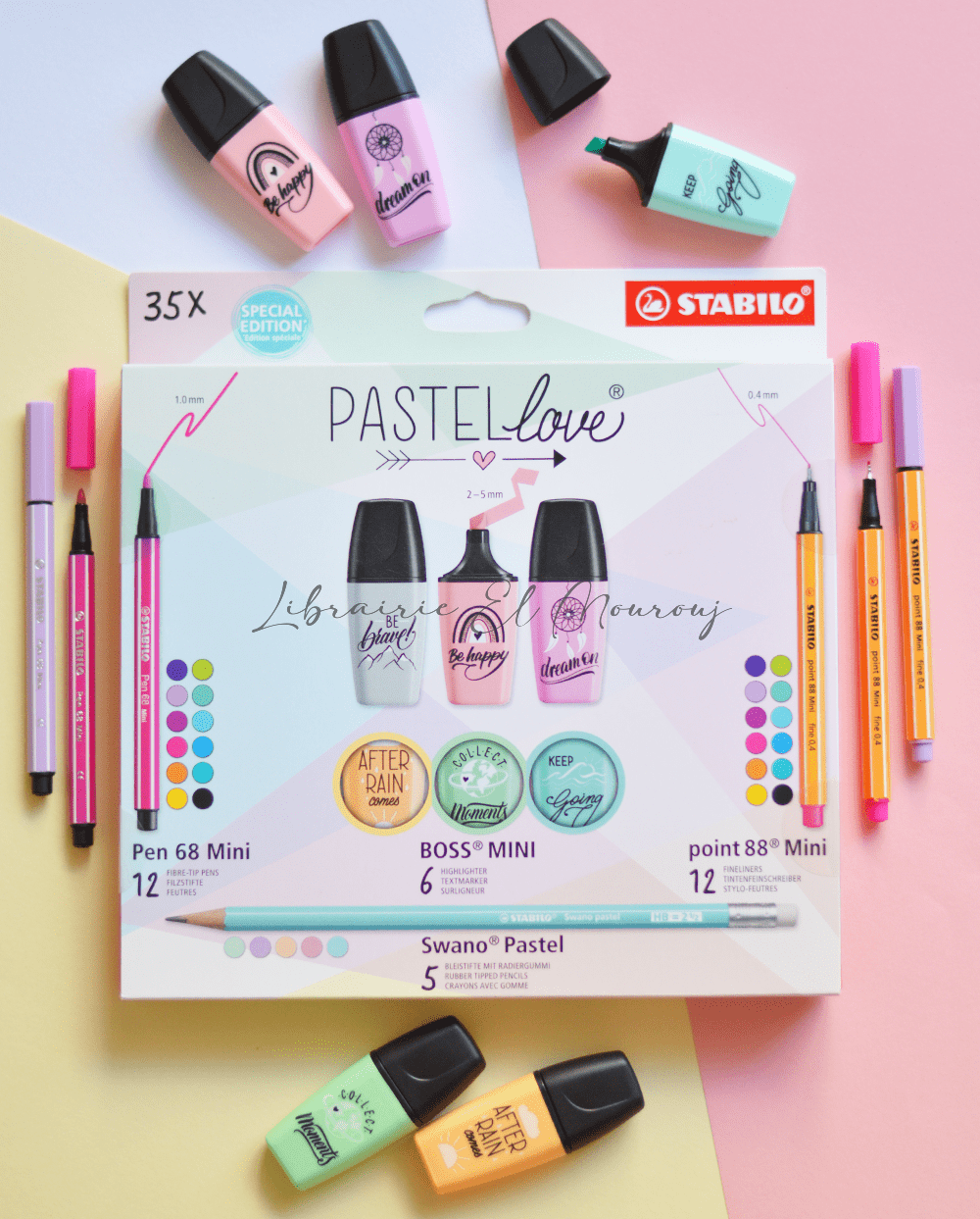 Stabilo Pastel Love x35 - 12 feutres mini, 6 Boss Mini, 12 stylo-feutre, 5 Swano Pastel crayons avec gomme