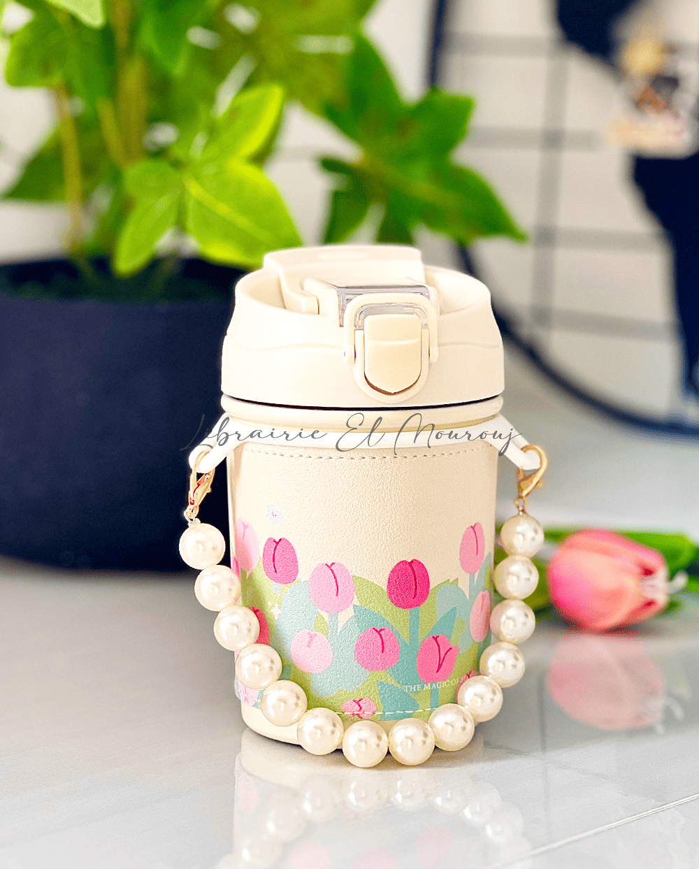 Mug isotherme 400ML à motif floral avec chaîne en perles