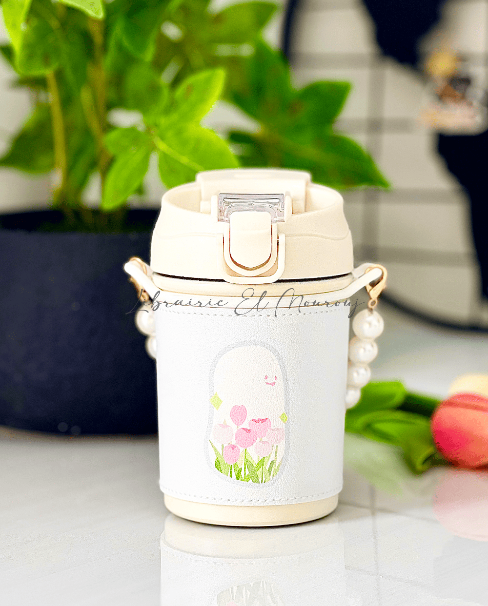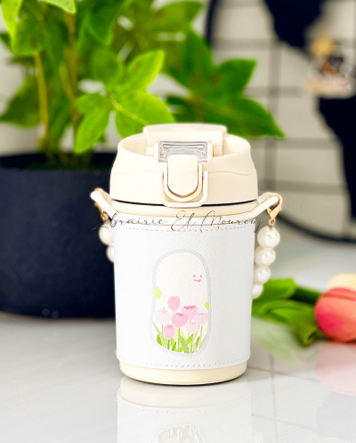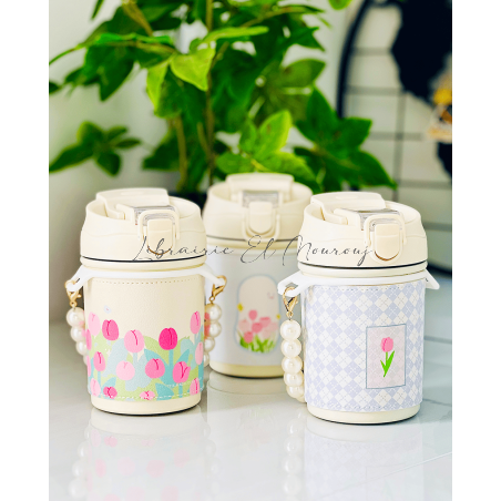 Mug isotherme 400ML à motif floral avec chaîne en perles