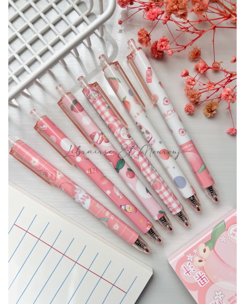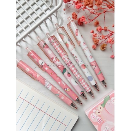 Pochette de 6 stylos gel super cute , design pêche , écriture en noir très fluide.